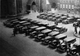 Een kijkje op het prachtige wagenpark op het binnenhof tijdens "de Groote Herstel Conferentie" in augustus 1929. Rechts beneden vier prachtige limosines van het merk Renault.