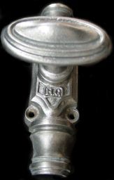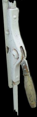 Verschillende voorbeelden van stolpdeurspanjoletten, de eerste en tweede met hoornen heft, de derde uit Frankrijk met koperen knop, de vierde met messing heft.